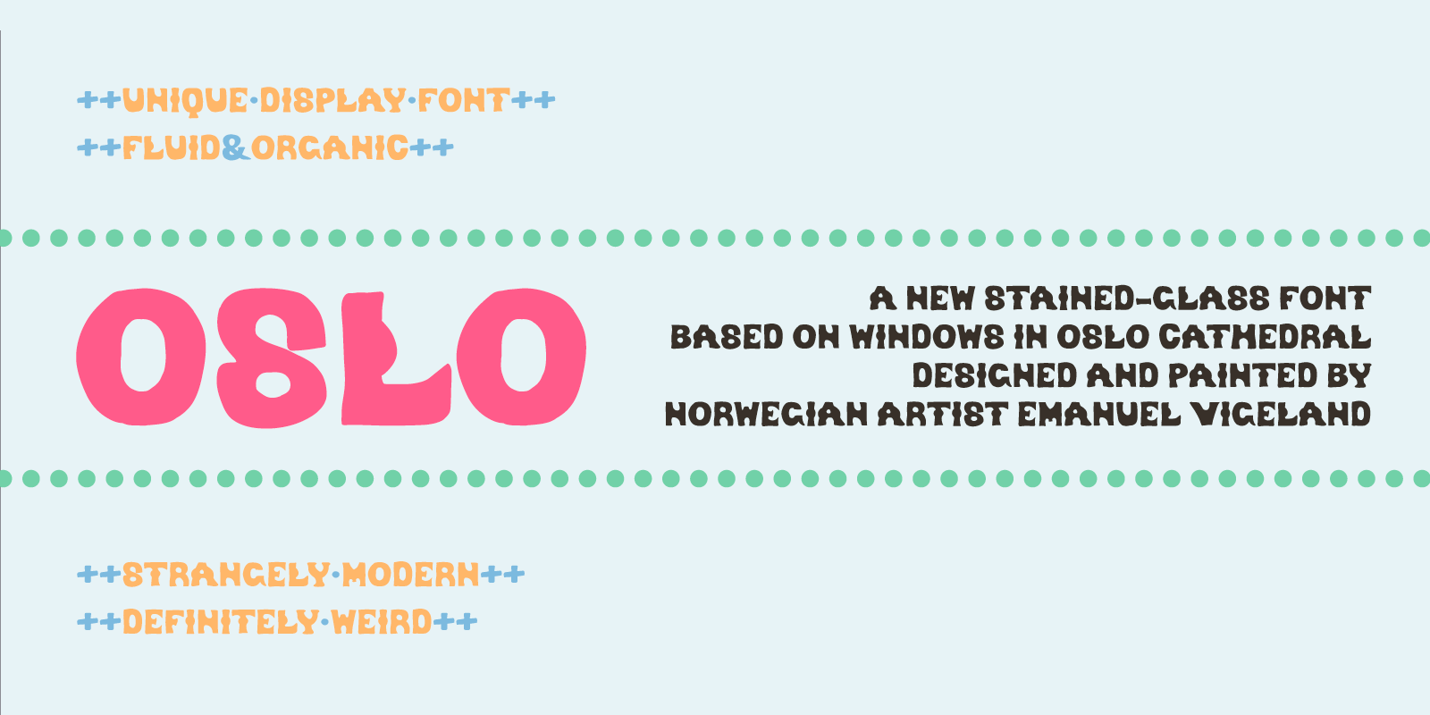 OSLO is a wild display font, based on the stained-glass windows in Oslo Cathedral. It's got a wobbly, hand-drawn feel, as suited to its original context. It looks great jammed up together with text, and in high-contrast situations.